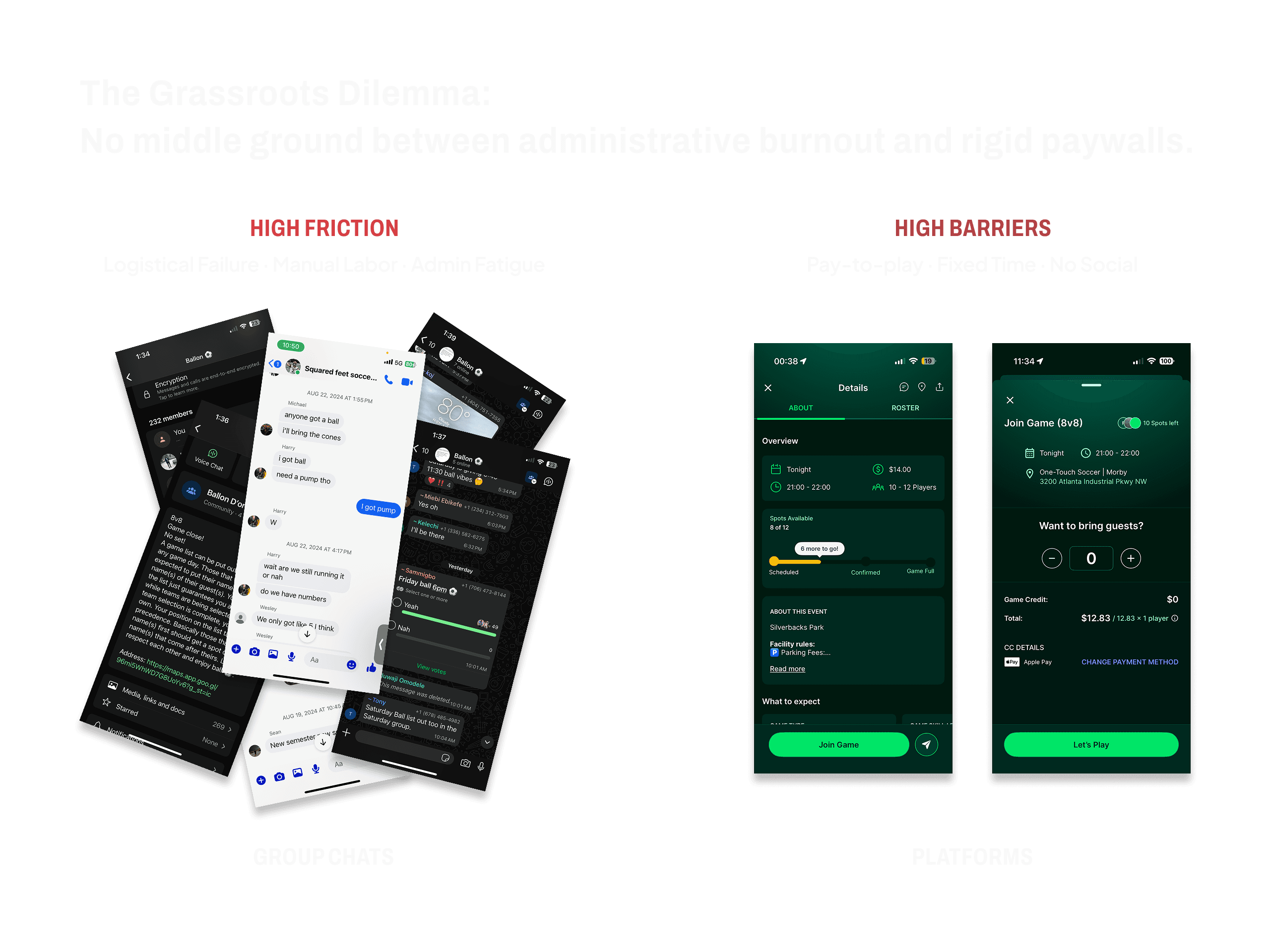 Pickup is among the most accessible way of engaging in soccer. Through interviews with 13 active players and organizers, we uncovered that the 'freedom' of pickup comes at a high cost: Admin Fatigue. Players are stuck manually chasing RSVPs, managing waitlists in Notes apps, and answering the same logistics questions daily. As one interviewee put it, 'Some don't show up and other brings a bunch extra guest… it's a mess.'