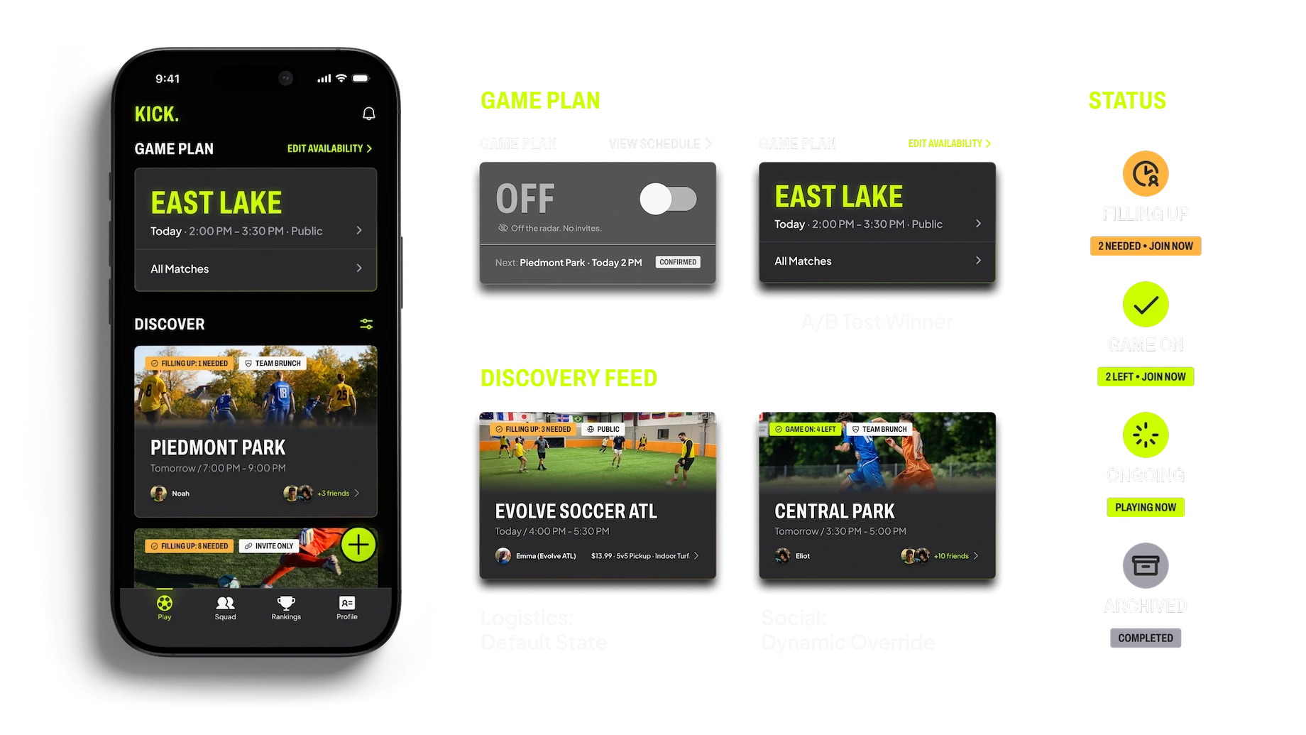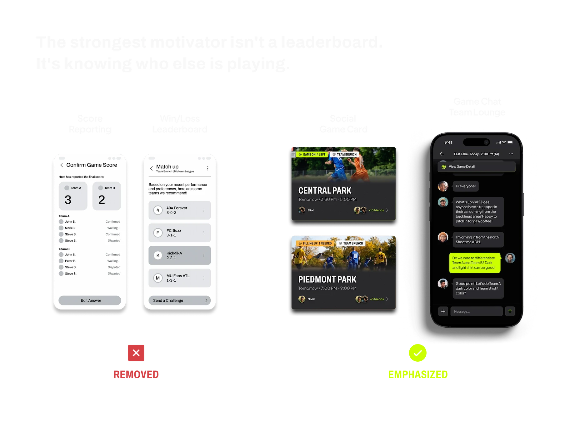 "Who's in the game?" surfaced as the single most critical factor for user decision-making. We stripped out the competitive features to double down on Social Cohesion. We introduced Adaptive Game Cards that instantly highlight friends, and built Team Lounges and Game Day Chat to facilitate connection beyond logistics. By removing the pressure to win, Kick is optimized for the true core of pickup: belonging.