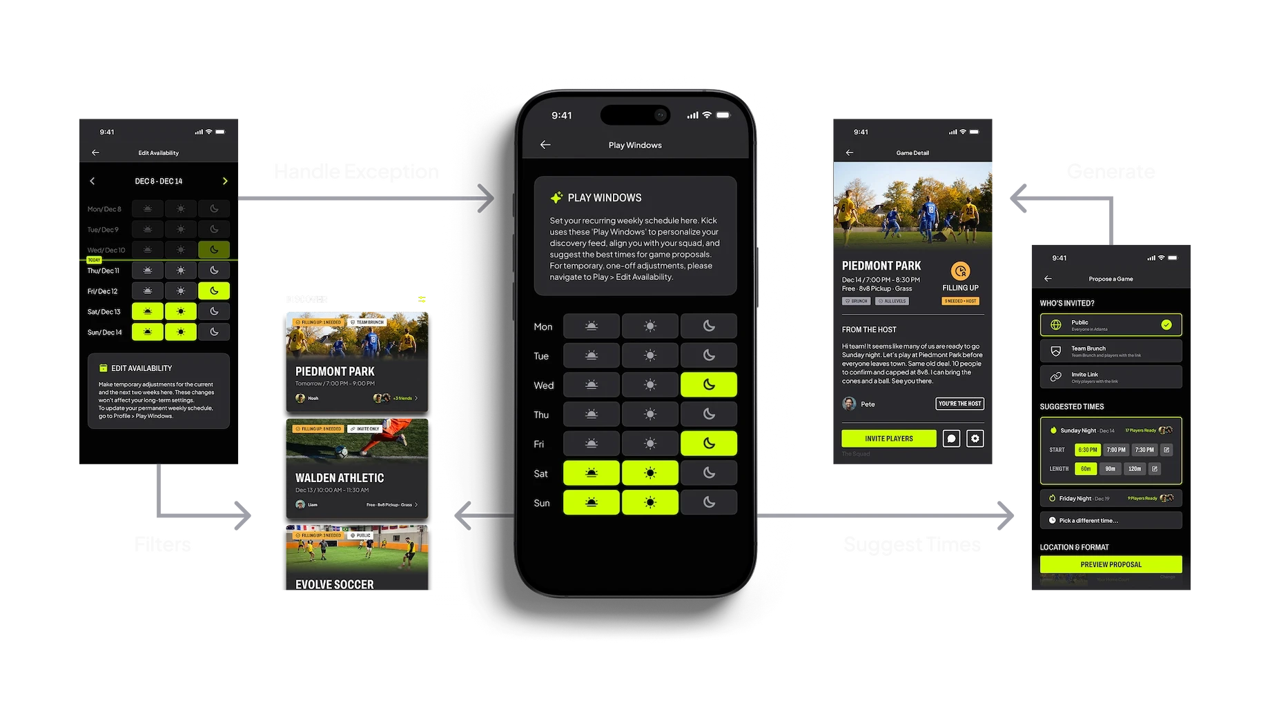 We went back to our research data and discovered a critical pattern: most players operate on consistent schedules interspersed with rare one-off opportunities. So instead of asking for availability per game, we built Play Windows, a system-level feature where users define their recurring slots once. The app algorithmically overlays these windows to automatically suggest the optimal kickoff time, turning a manual chore into an automated utility.