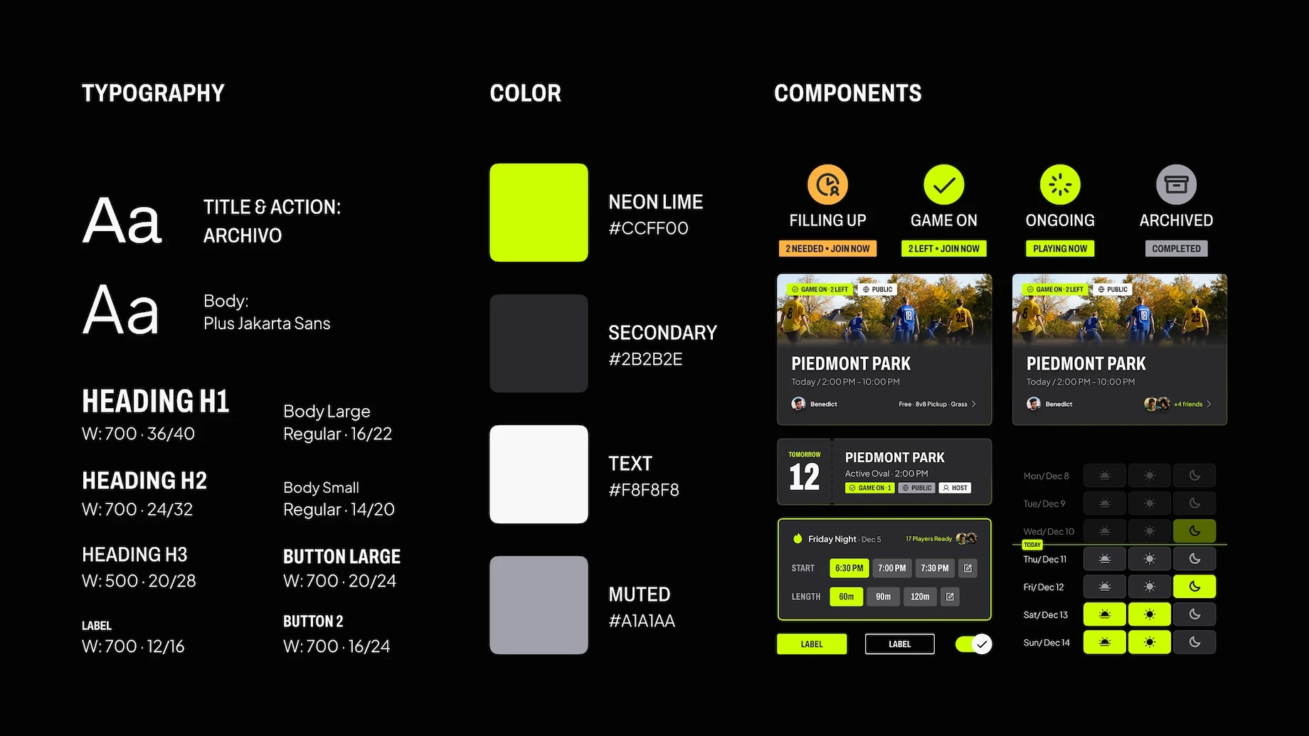 To capture the raw 'street' vibe of pickup, we utilized a Dark Mode foundation. We paired Archivo (All Caps) with Neon Lime to deliver high-energy interaction cues. This intensity is grounded by Plus Jakarta Sans and muted tones, ensuring the experience remains strictly usable without sacrificing its athletic edge.