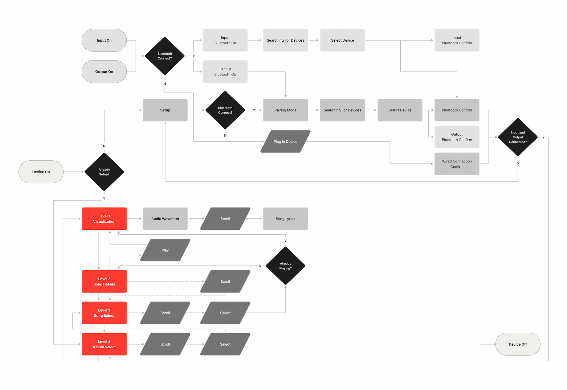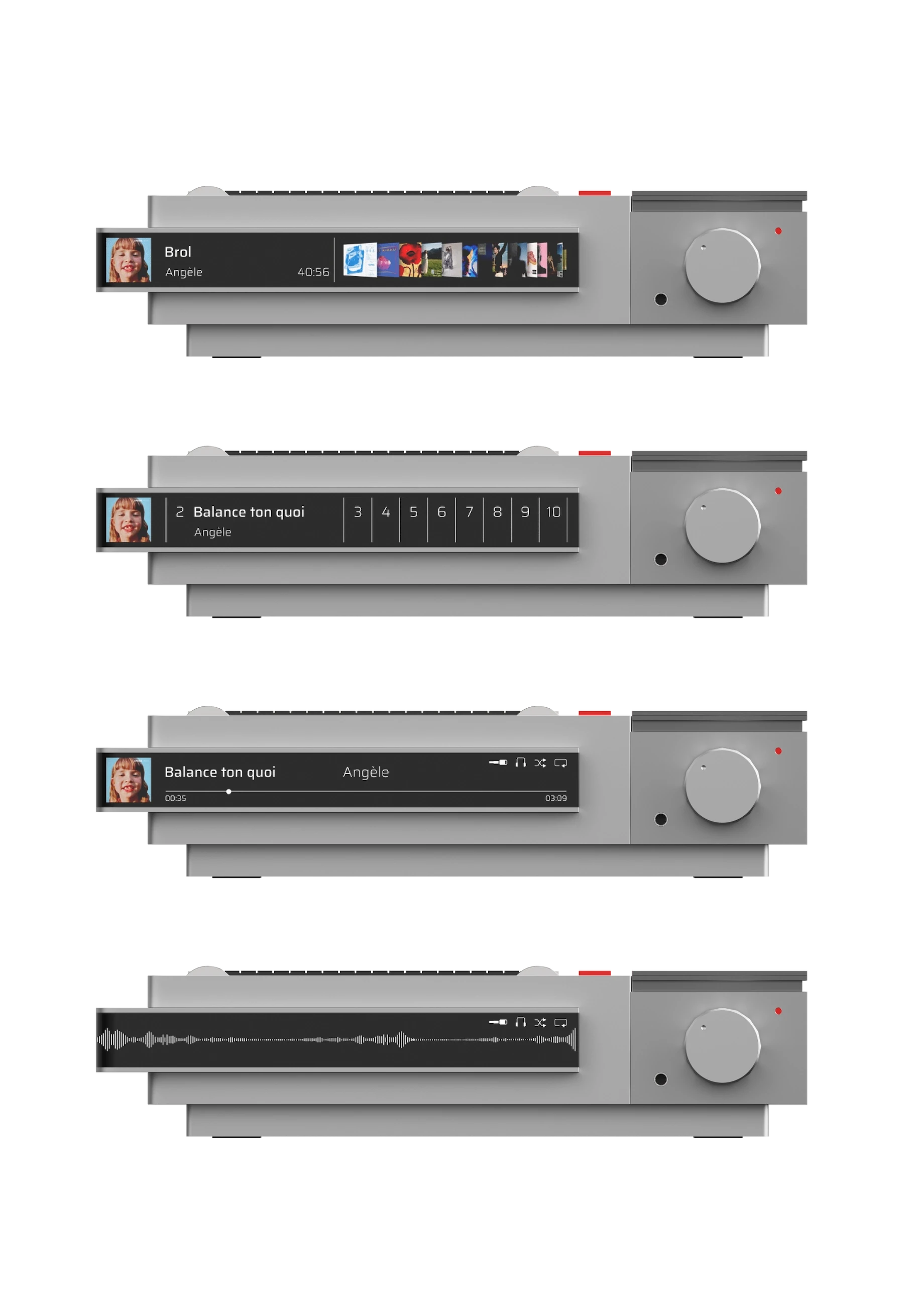 At the top front, a Red Button and Scroll Track form the main interface, letting users easily move between tracks, browse within playlists, or explore others. The scroll track enables smooth, screen-free navigation.