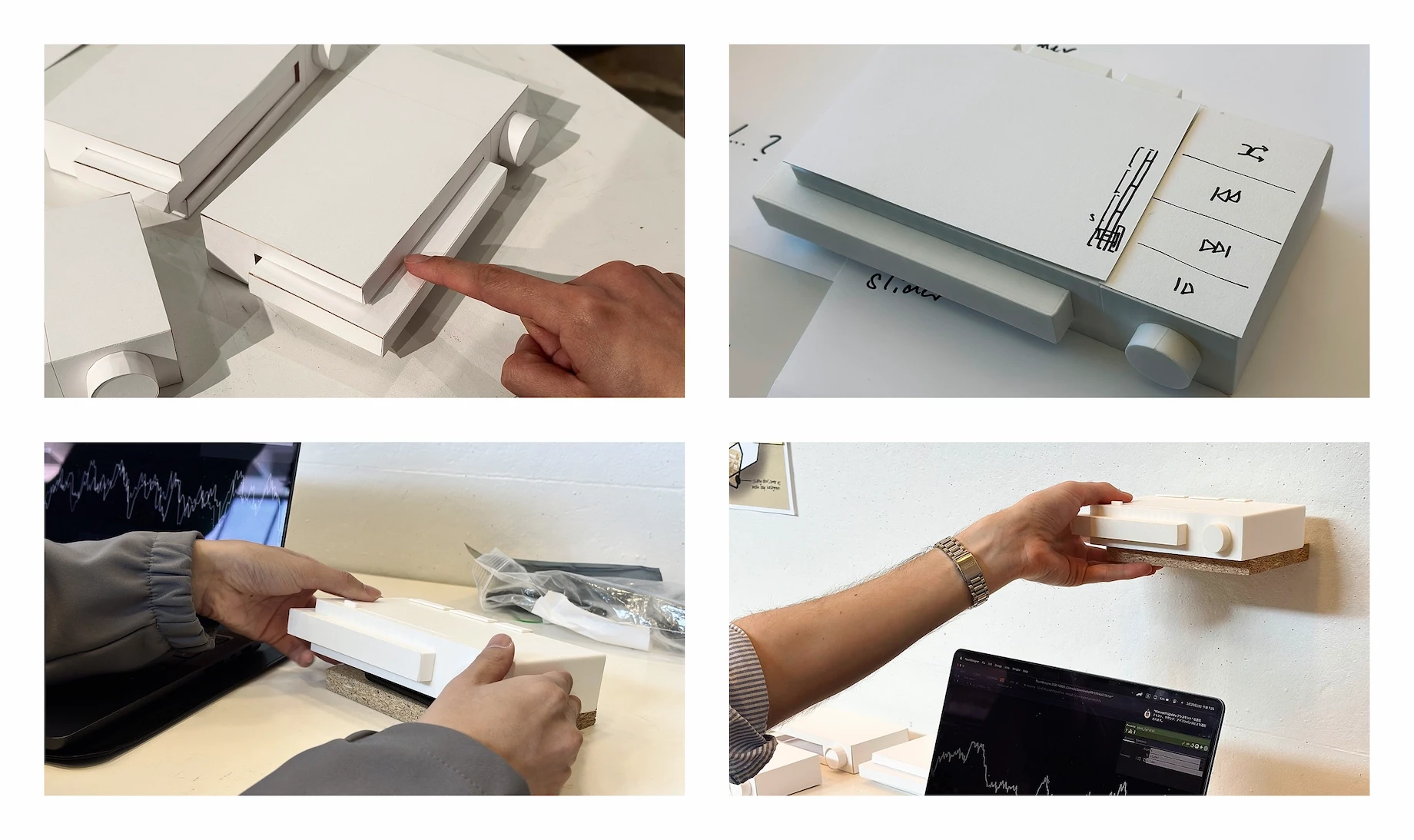 Rounds of prototyping and testing were done, from fast paper mock-ups produced for scale and concept visualization in rapid form testing to functional models with button for a physical control interface following user feedback.